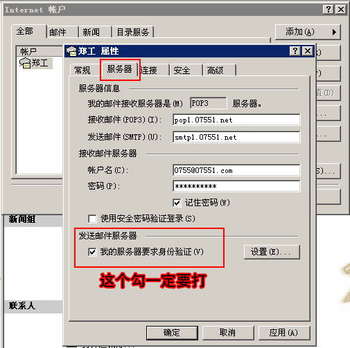 第九步:重點:鏈接"服務器"然后打上"我的服務器要求身份驗證"勾