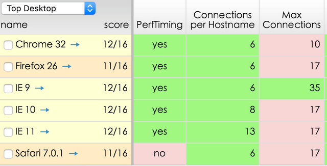 上圖展現了各瀏覽器的并行銜接數(同域名),能夠看到在一些現代瀏覽器內每個 hostname 的最大銜接數根本都是6個,IE 稍顯傲嬌,總體而言并發數不高。 所以 PC 年代對靜態資本優化時,通常將靜態資本散布在幾個不一樣域,確保資本最完美地分域名存儲,以供給最大并行度,讓客戶端加載靜態資本更為敏捷。
